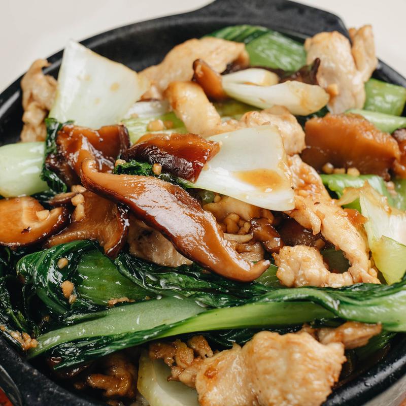 Crispy Rice Charred / Burnt in a Clay Pot topped with Stir-Fry Shiitake Mushroom and Bok Choy